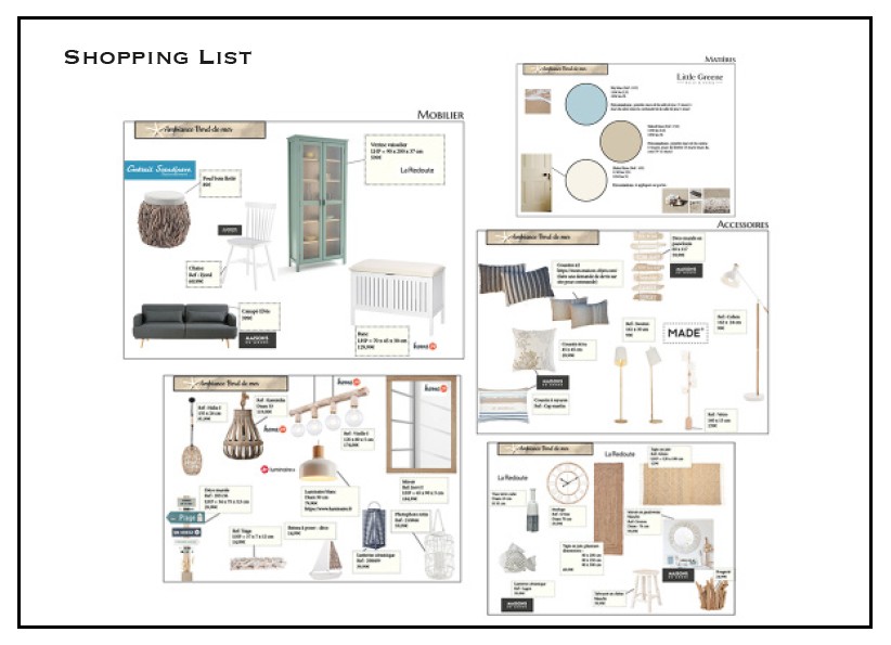 Je réalise pour vous une liste d’achats pour vos matériaux, mobiliers et accessoires déco – avec option commande et livraison – vous n’avez plus qu’à choisir et vous laisser porter !